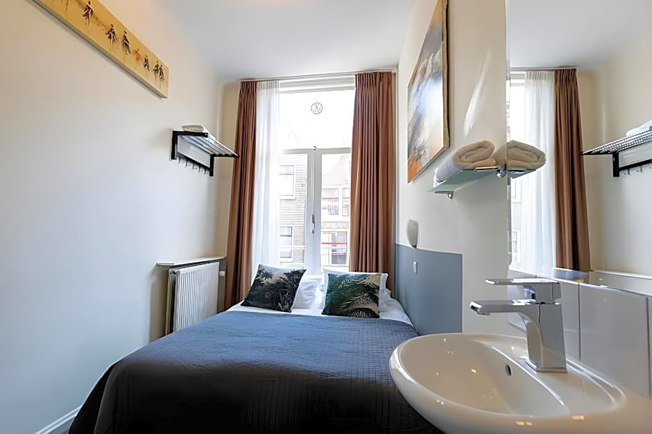 A compact room with a flat-screen TV with cable channels, a sink and shares a shower and toilet.
